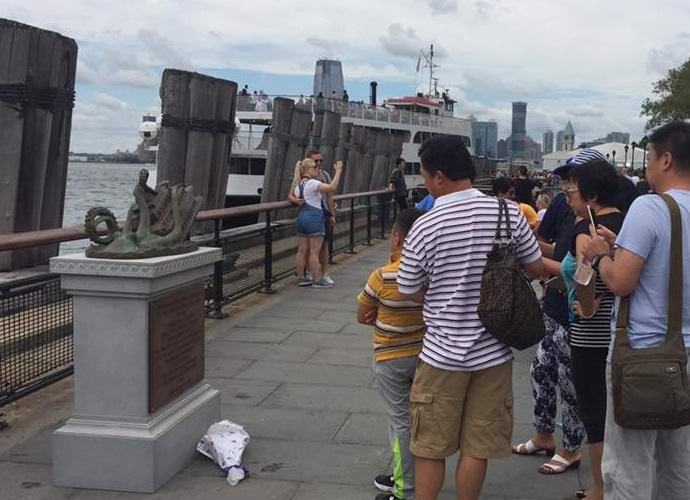 This bronze monument weighing one hundred and fourteen kilograms was recently installed in Battery Park in Manhattan. Sculpture called to honor the memory of people who allegedly drowned in 1963 by the fault of the huge octopus, ferry Staten Island